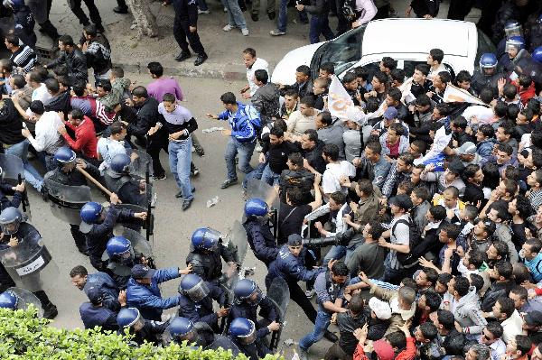 Algerian university students clash with police during their protest in downtown Algiers, capital of Algeria, on April 12, 2011. They required the improvement of their social and educational status as well as reconsideration and change of education system. [Photo/Xinhua] |